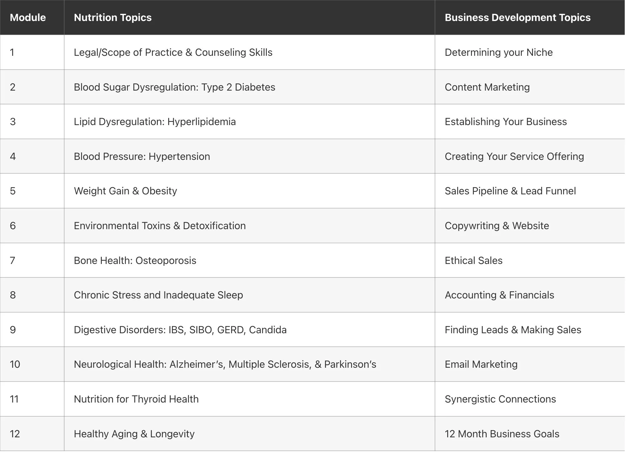 These our the 12-modules we started with! We already added 2 more: Reproductive Hormone Health and Sports Nutrition!